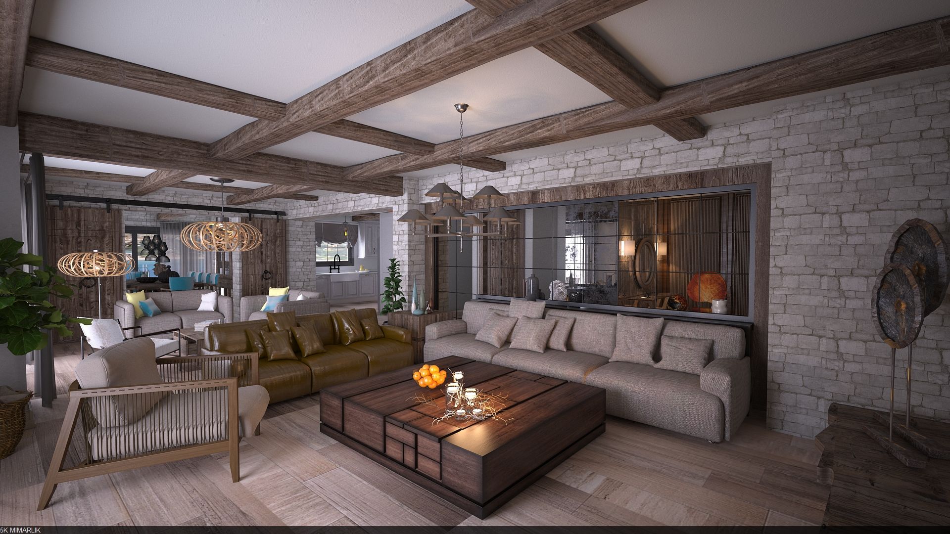 Rustik dokularla ahşap parke zemin uygulamalarını daha ferah bir atmosferle buluşturur. Tavanları daha yüksek gösteren yerleşim planı ile çok fazla sayıda mobilya ya da aksesuar kullanılmaz. Oturma odasına bakan avlu, balkon ya da teraslar için geniş pencere açıklıklarıyla aydınlık ve ferah bir atmosfer oluşması sağlanır.