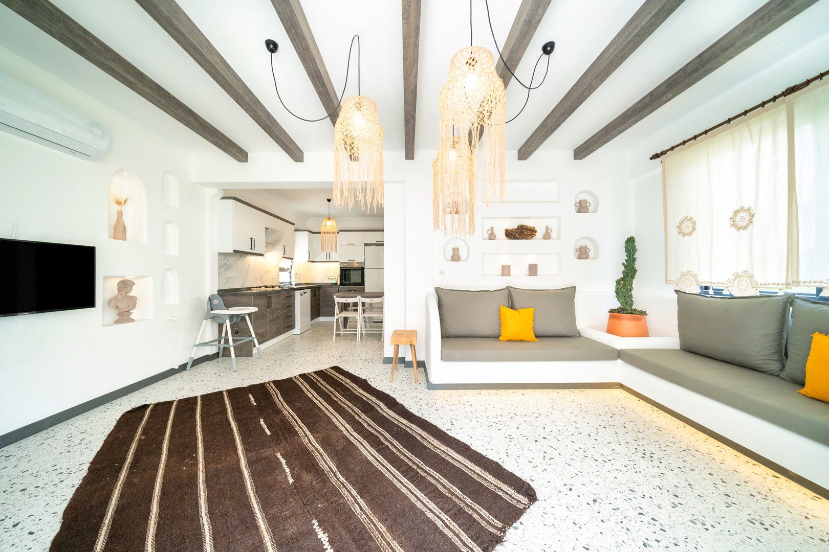 Kırmızı, portakal ve kahverengi gibi sıcak renklerle açık renk tonlarında zemin kaplamalarını bir araya getirebilir; turkuaz mavi, yeşil ya da sarı tonlarında dokunuşlarla beyazın muntazam uyumunu ön plana çıkarabilirsiniz. Renkli minderler, ferahlık katan maviğ perdeler ve natürel dokularıyla halı ya da kilimler kullanabilirsiniz.