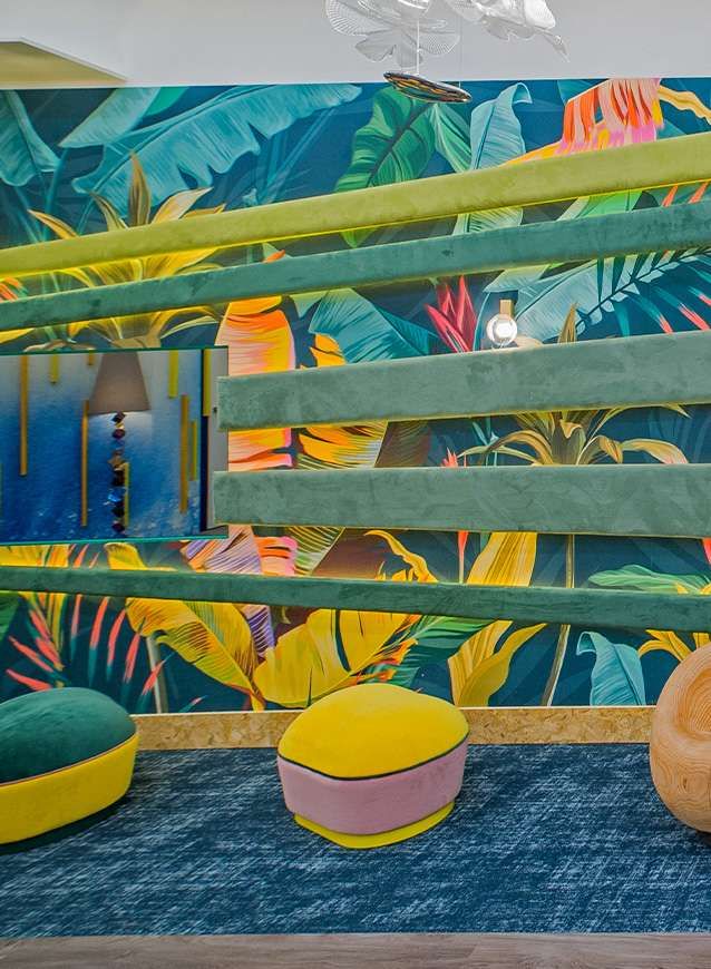 Sade veya iddialı, oturma odası nasıl olursa olsun yeşil mutlaka kullanılır. Desen olarak ise bitkiler ve tropik çiçekler öne çıkar. Hayvanlar da stilde motif olarak yer alır. Papağan ya da maymun gibi egzotik hayvanlar tropikal tarza uygun düşen eğlenceli figürlerdir. Bitki ve hayvan desenlerine ek olarak muz baskısı da mobilya ve duvar kağıtlarında kullanılır.